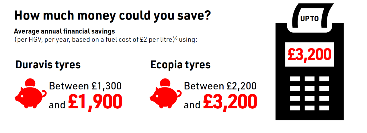 • Between 1,100 litres and 1,600 litres on Ecopia tyres, which translates into £2,200 and £3,200 of annual financial savings.